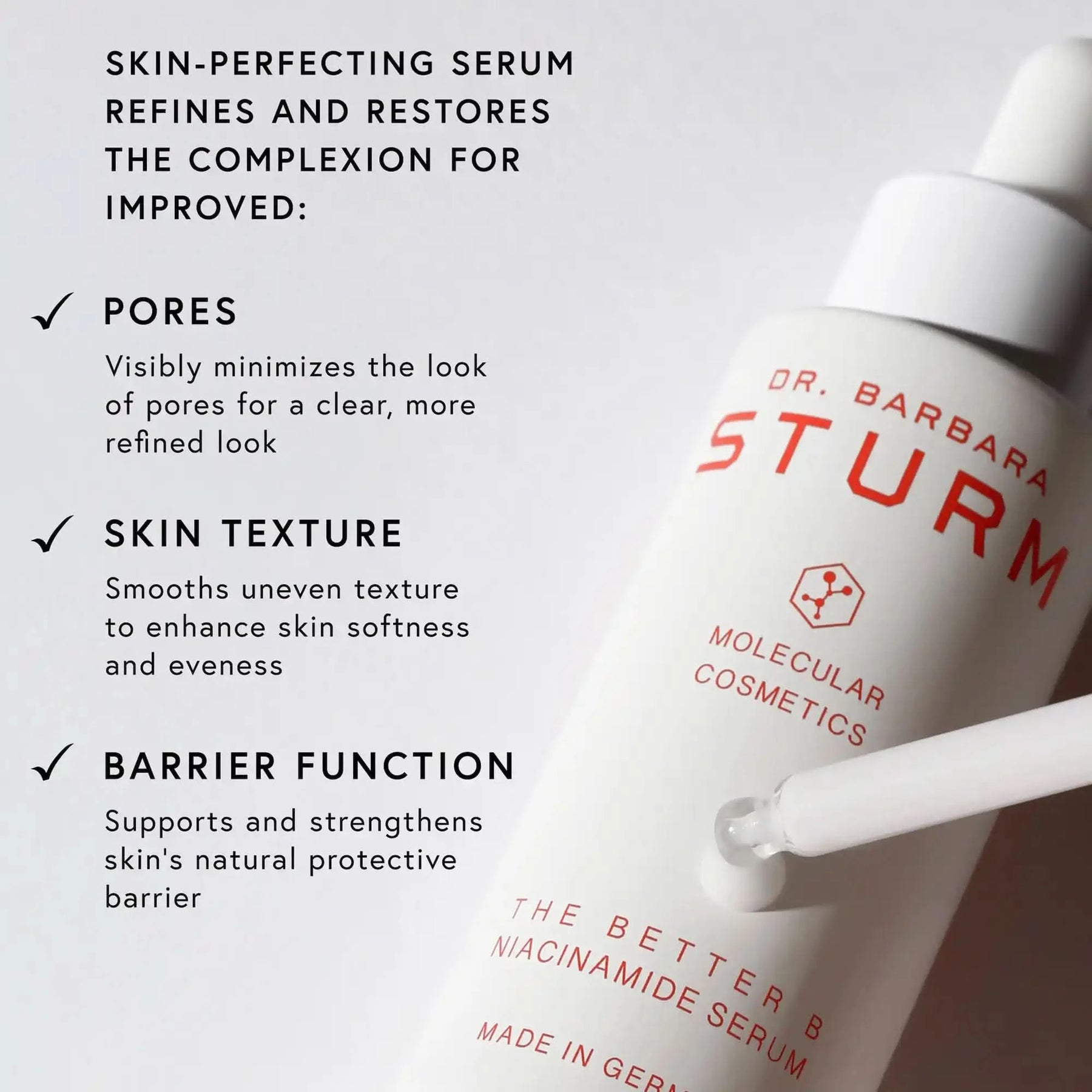Dr. Barbara Sturm’s THE BETTER B NIACINAMIDE SERUM, is the ultimate skin perfector that specifically targets the pores, reducing and refining their appearance for a radiant complexion.