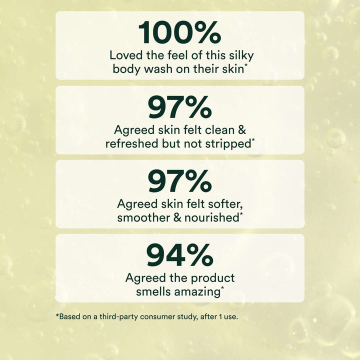 Research Results: In a consumer study on 32 women after 1 use: - 100% loved the feel of this silky body wash on their skin - 97% agreed skin felt clean and refreshed but not stripped.